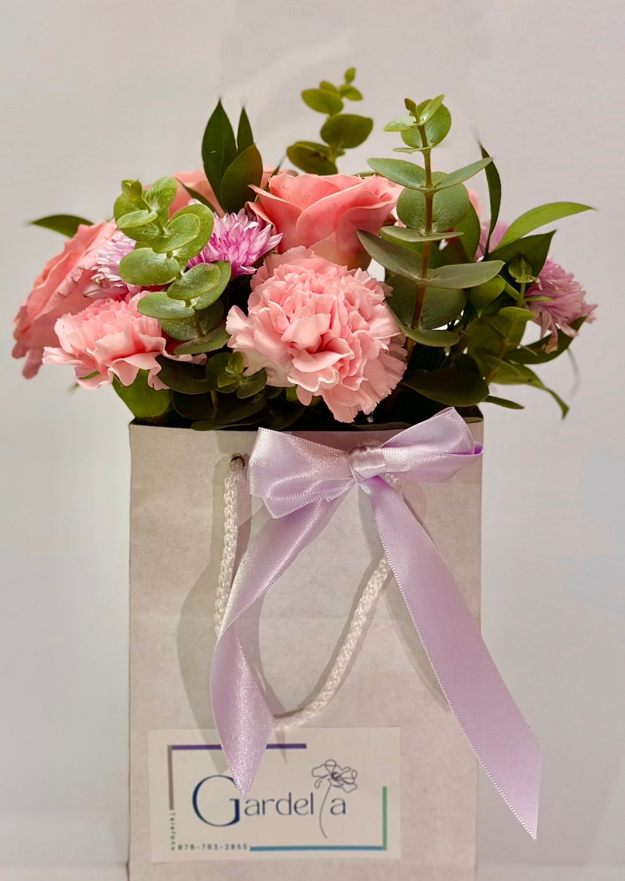 Bolsita con Rosas, Margaritas y Dollar. Incluye tarjeta dedicatoria.