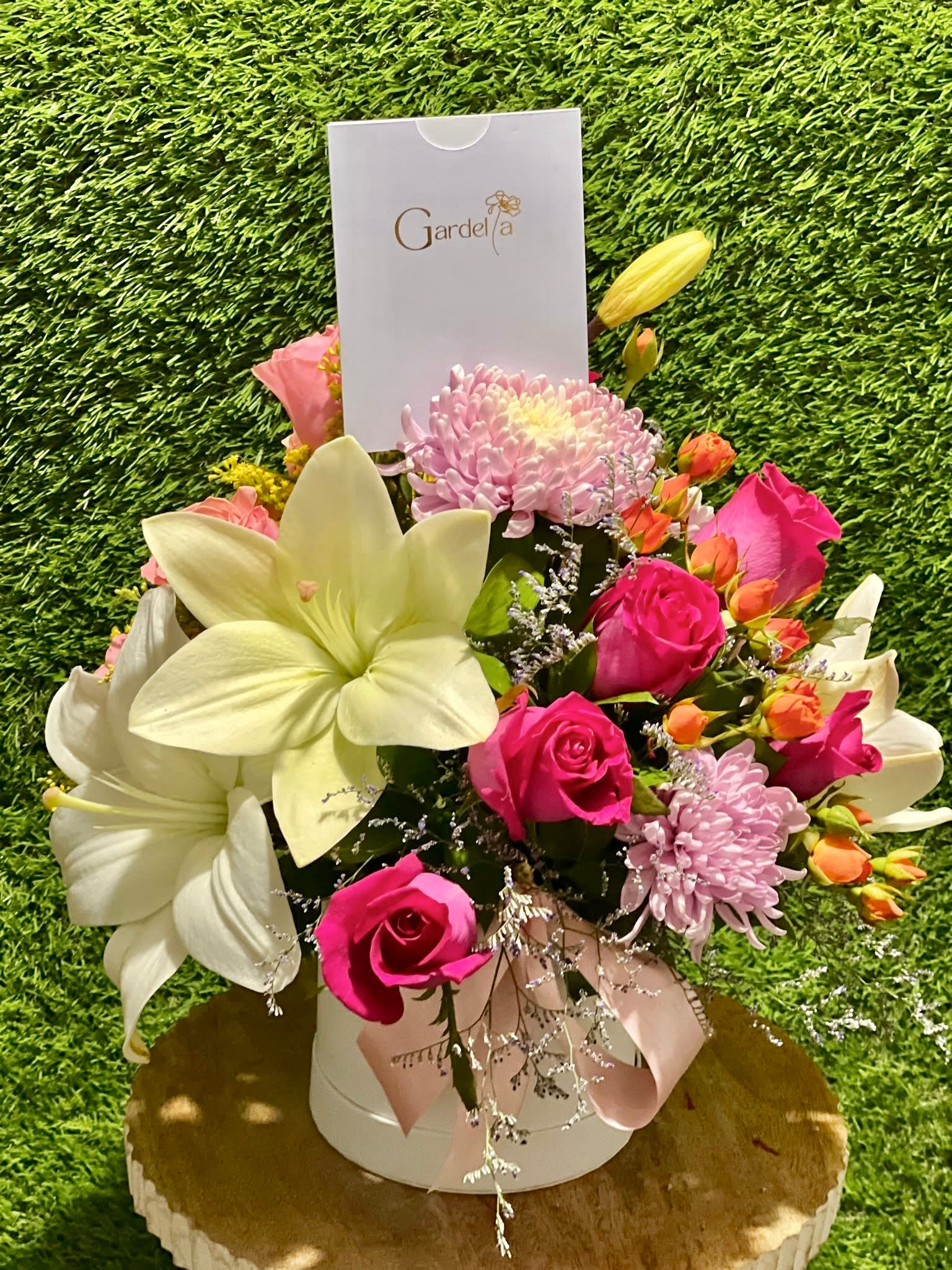 Caja con rosas, Lilys y Roxanas. Incluye tarjeta dedicatoria.