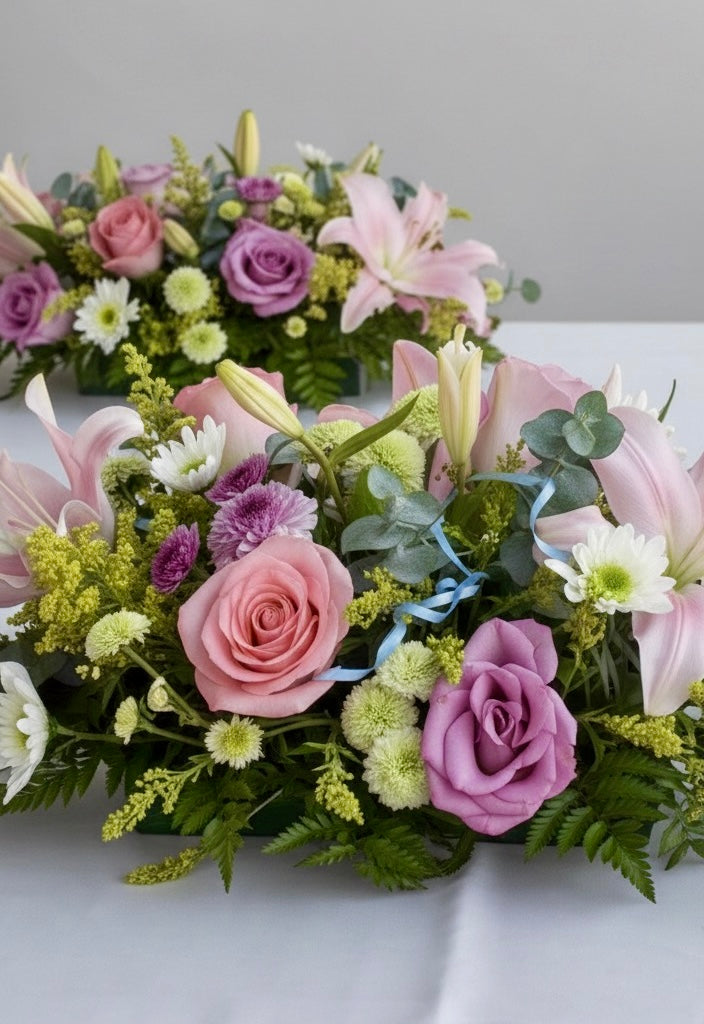 Seis (6) centros de mesa con Lilys, Rosas, Margaritas y Lether.