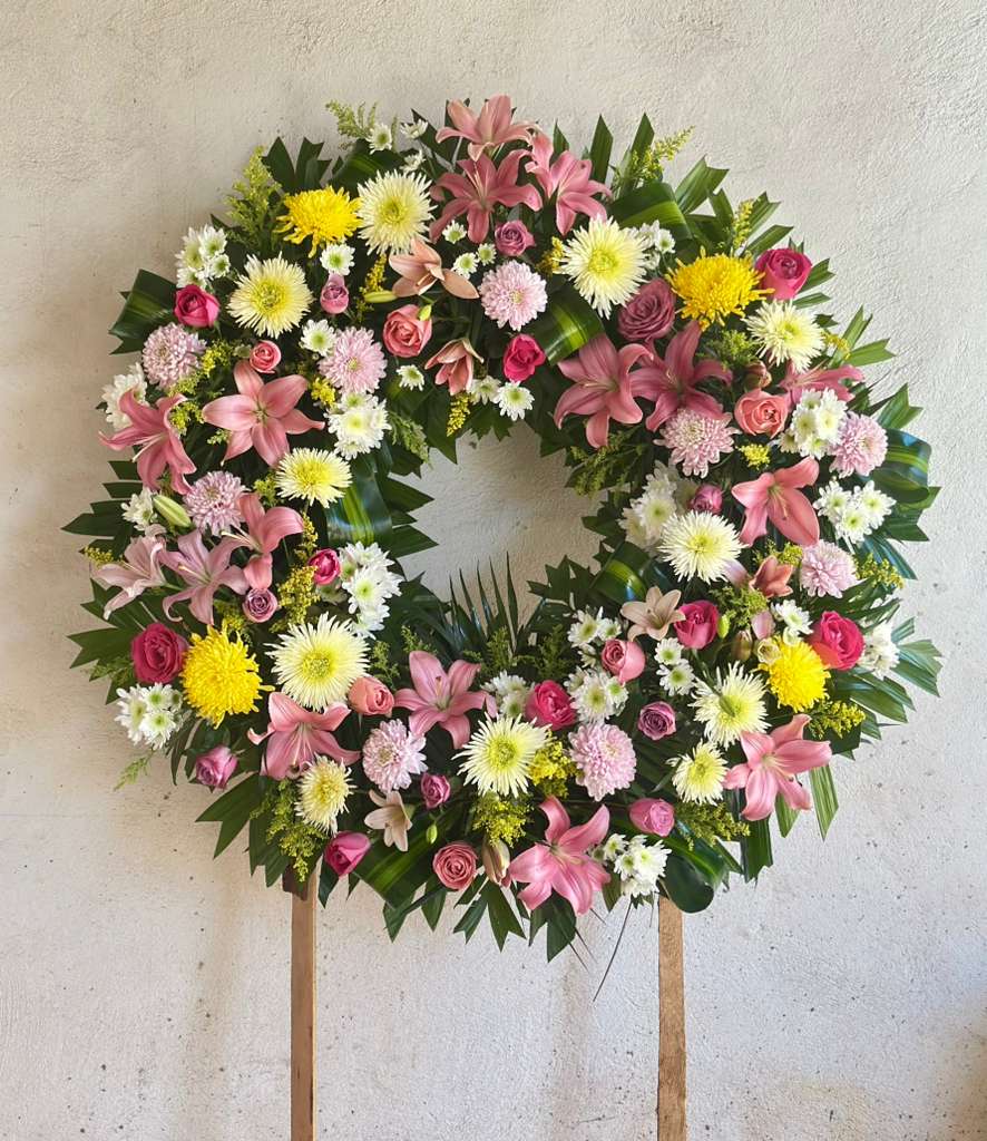 Corona variedad de flor en tonos según el gusto del cliente. Incluye Banda dedicatoria