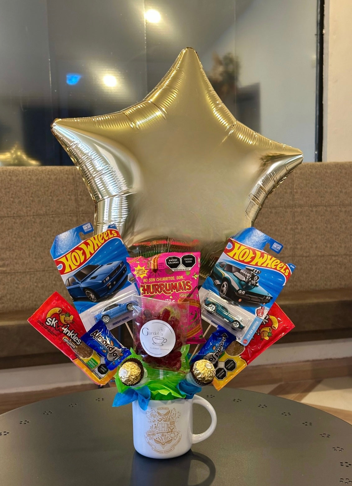Taza decorada con globo. Incluye dos (2) carritos hot wheels y dulces.
