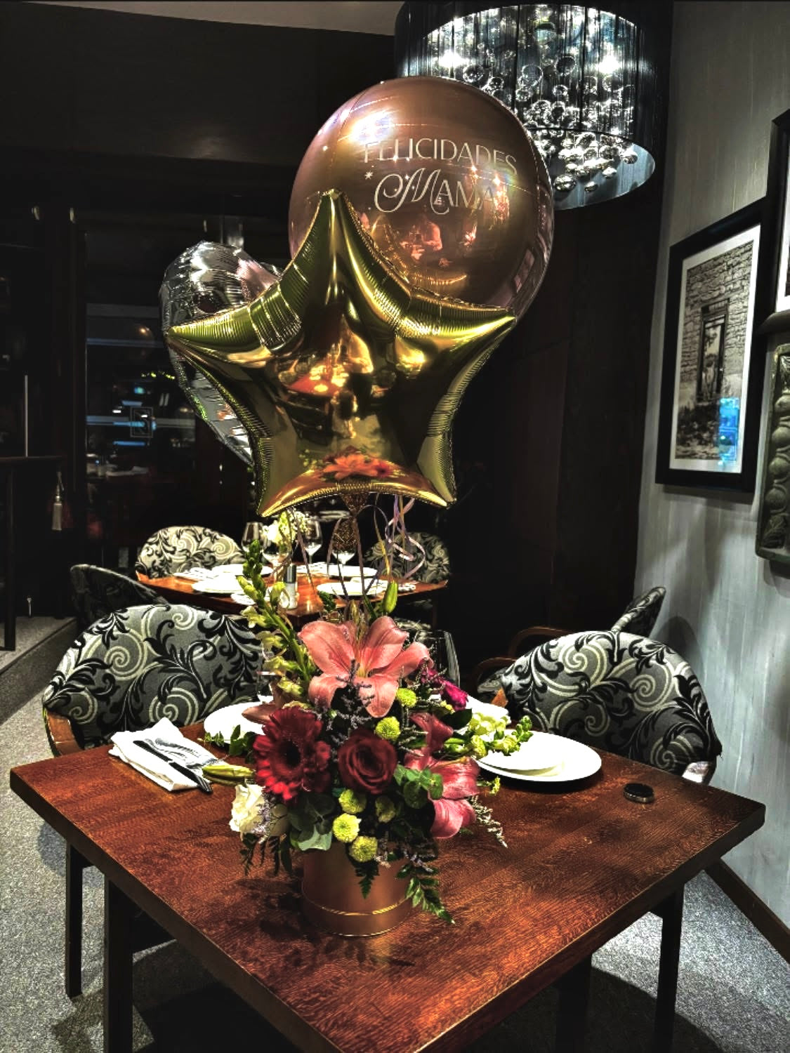 Arreglo floral con Lilys y Rosas y Gerberas. Tres (3) globos con tarjeta dedicatoria.